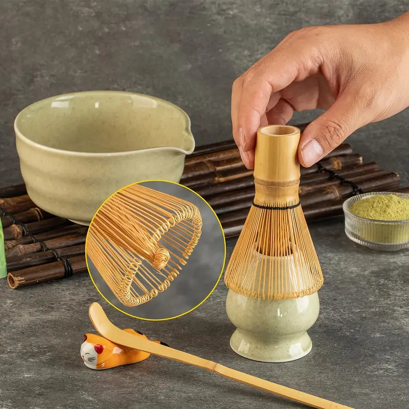 Der Bambusbesen (Chasen) mit 80 Streben sorgt für den unverwechselbaren cremigen Schaum, der hochwertigen Matcha auszeichnet. Durch die feine Handarbeit entsteht ein gleichmäßiges Aufschlagen, sodass sich Pulver und Wasser zu einer harmonischen Einheit verbinden.